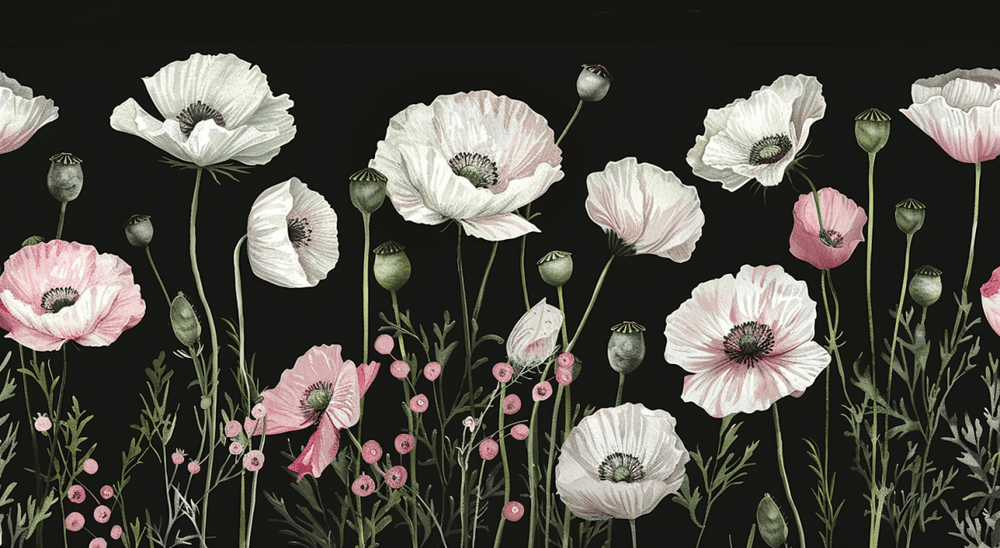 Plongez dans un univers raffiné avec le papier peint Éveil Floral. Ce design présente des coquelicots blancs et roses en contraste sur un fond noir profond, créant une atmosphère à la fois élégante et captivante. Ce papier peint est disponible en trois finitions pour s'adapter à vos besoins décoratifs :