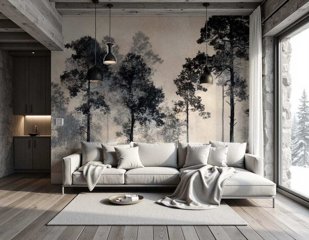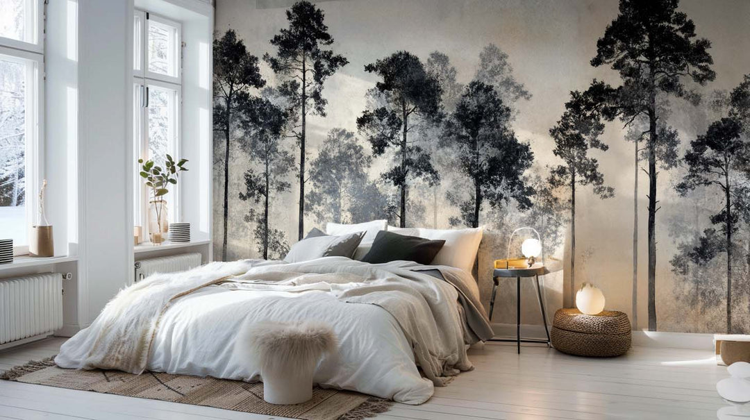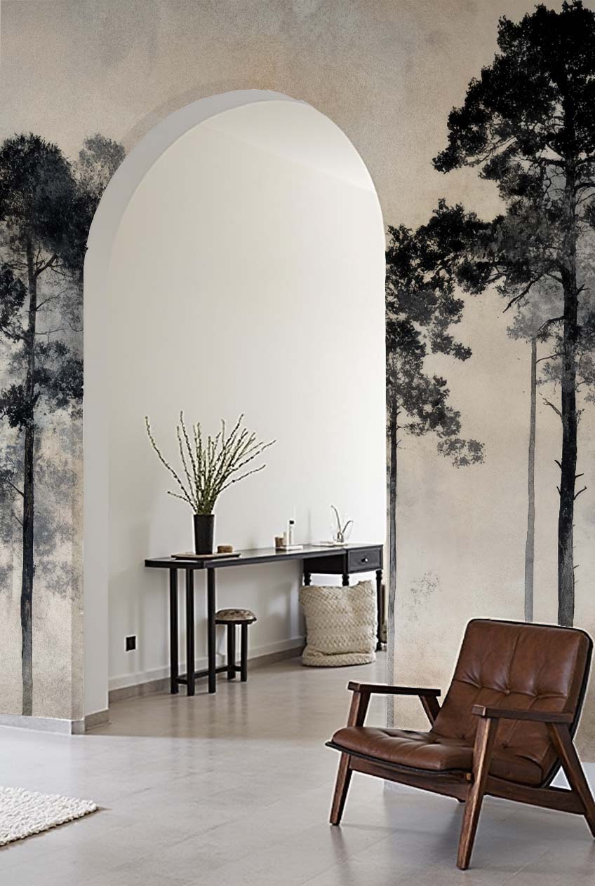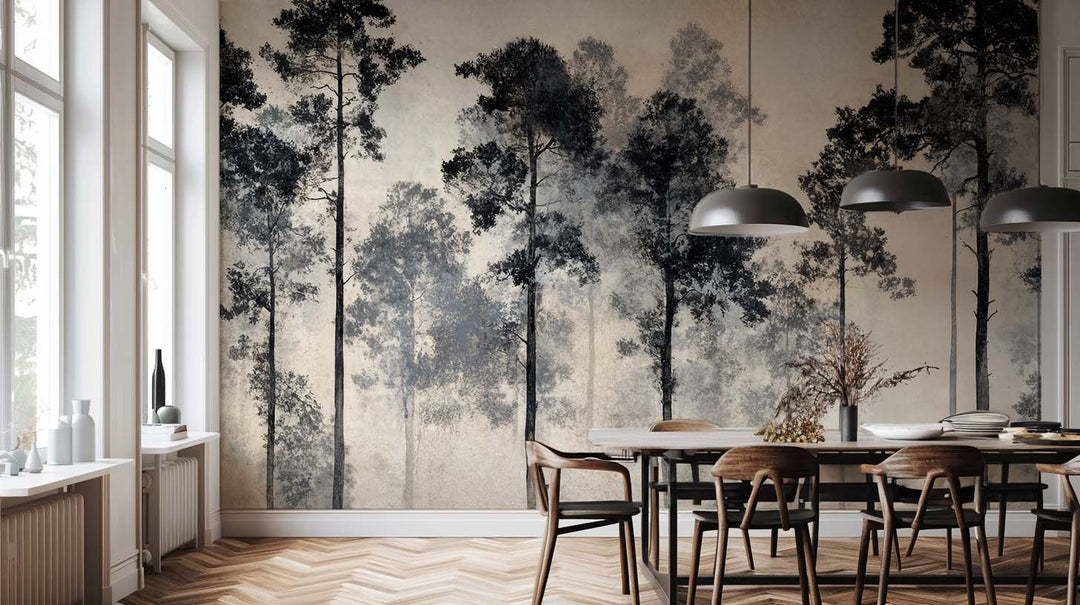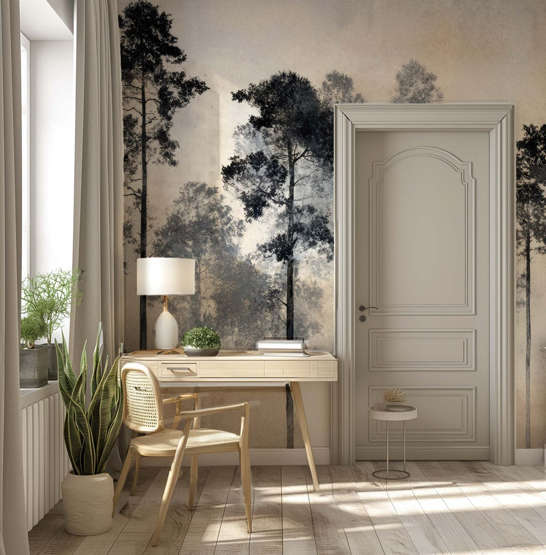 Laissez-vous transporter par "Voyage au cœur des pins", un papier peint panoramique forêt brumeuse, entre poésie et sérénité.