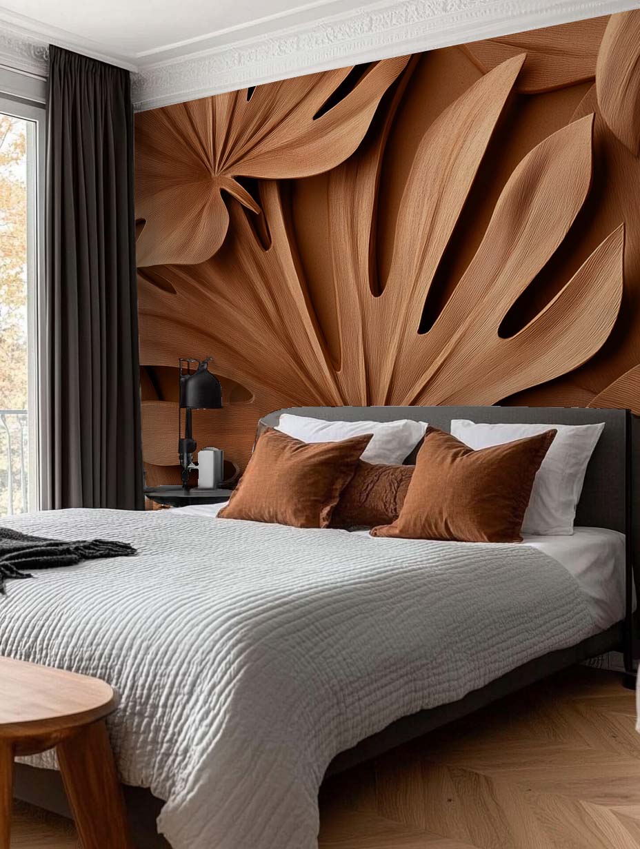 Apportez une touche chaleureuse et naturelle à votre intérieur avec le papier peint Feuilles exotiques terracotta : Papier peint effet 3D. Les grandes feuilles en relief donnent une impression de profondeur saisissante, transformant instantanément votre espace.