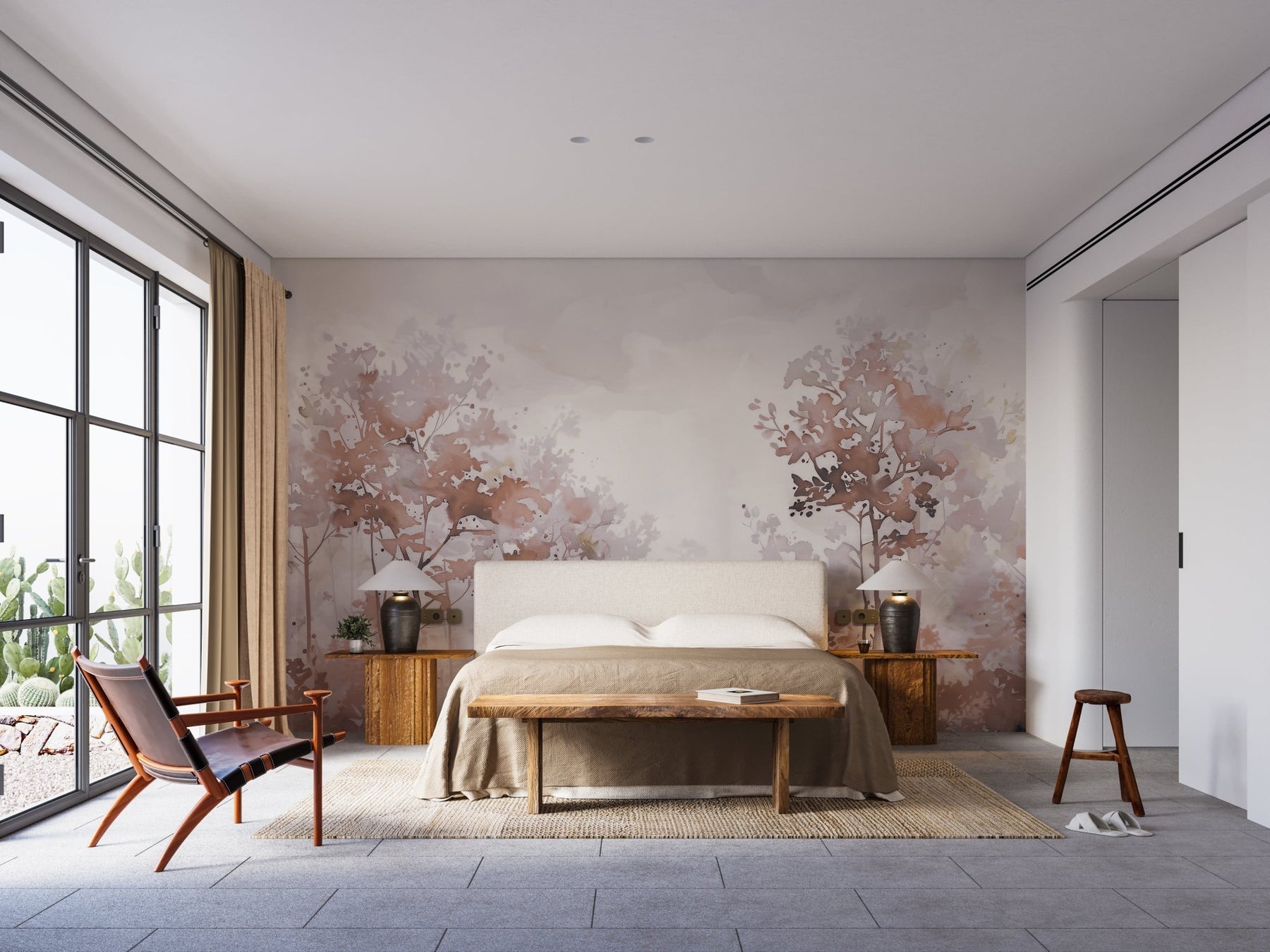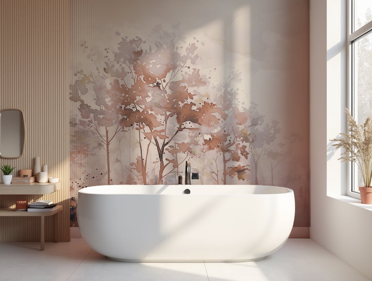Poésie printanière en beige – Papier peint arbres en aquarelle aux tons poudrés