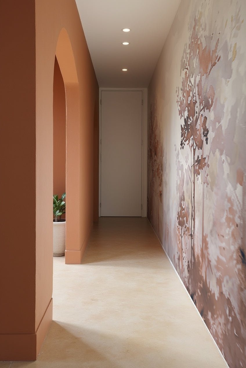 Le papier peint Poésie printanière en beige agrandit visuellement l’espace. En effet, la perspective diffuse et les teintes claires accentuent la sensation d’ouverture.