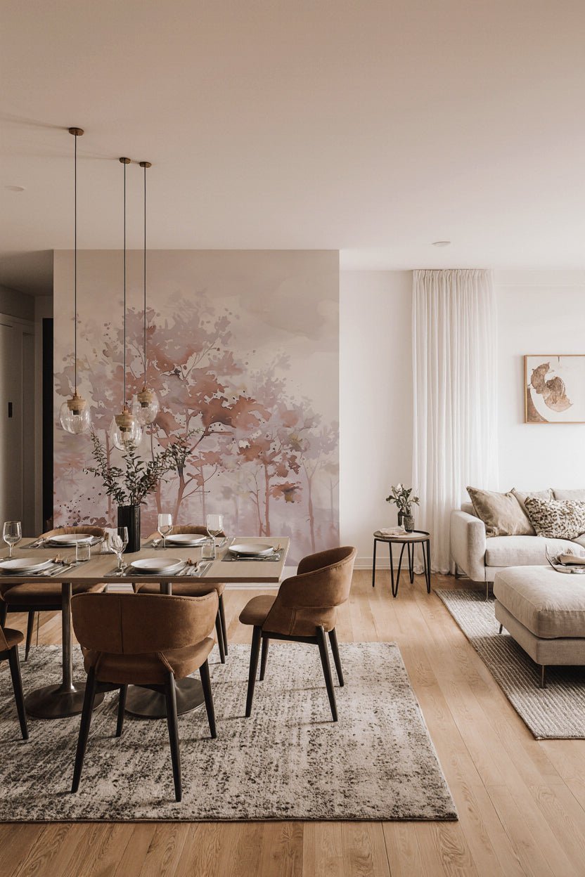Le papier peint panoramique Poésie printanière en beige – Papier peint arbres en aquarelle aux tons poudrés transforme vos murs avec délicatesse.