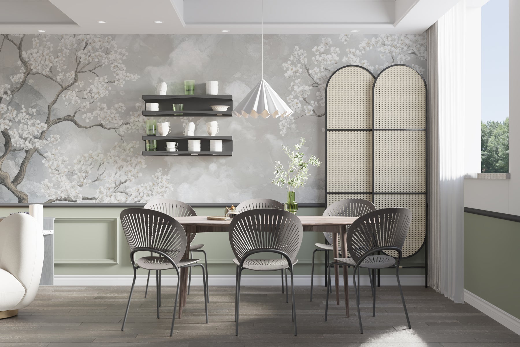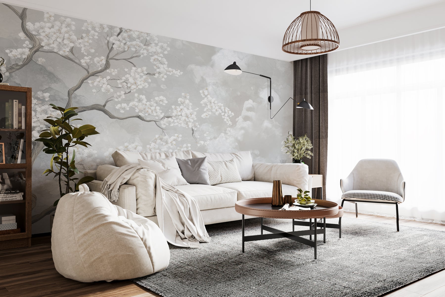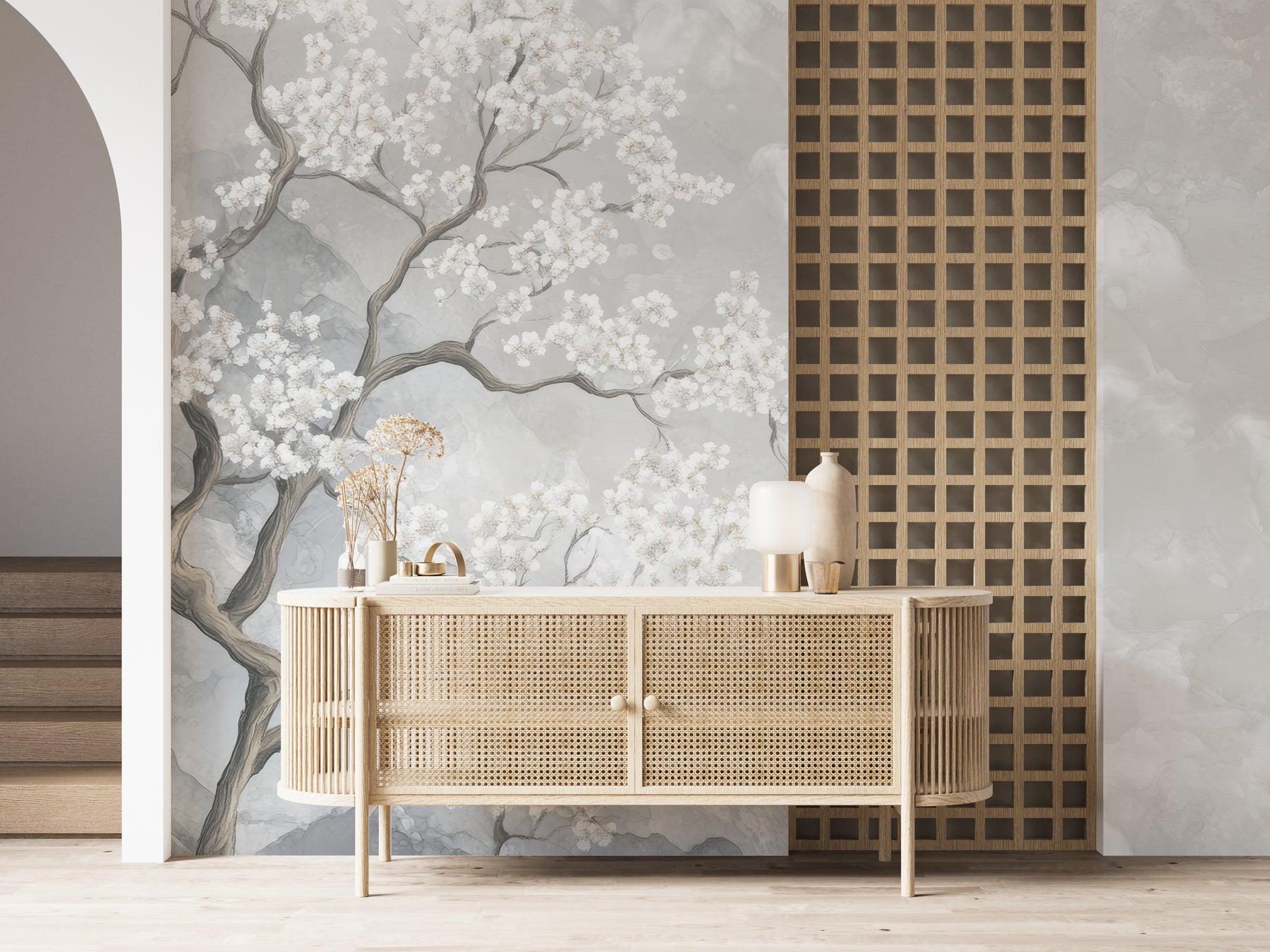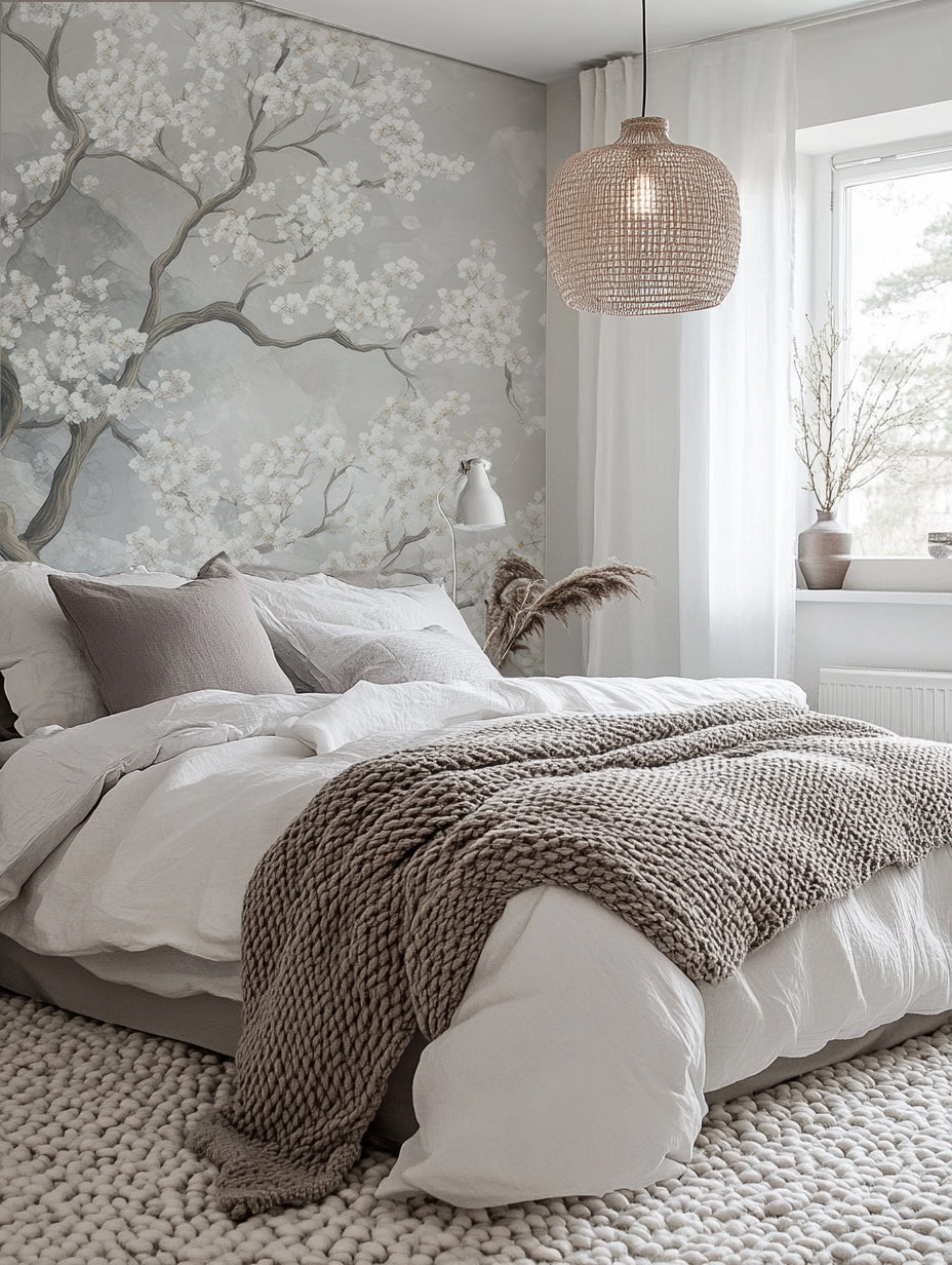 Transformez votre espace avec la beauté délicate de Nuages de Cerisiers. Ce papier peint panoramique évoque la douceur des cerisiers en fleurs, s’élevant dans une brume éthérée de nuances grises et blanches. Ce design floral apporte une touche de poésie et de sérénité à votre intérieur.