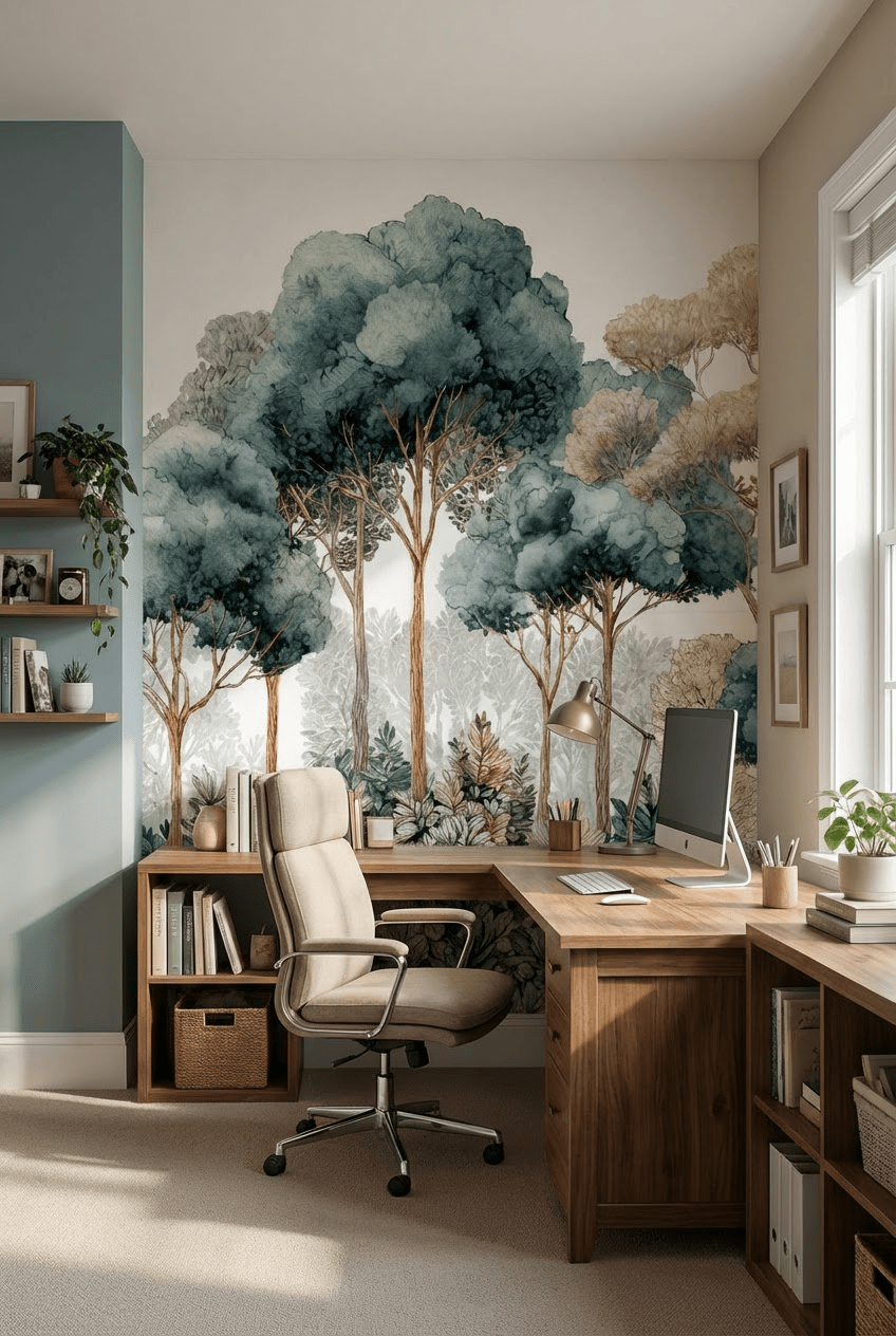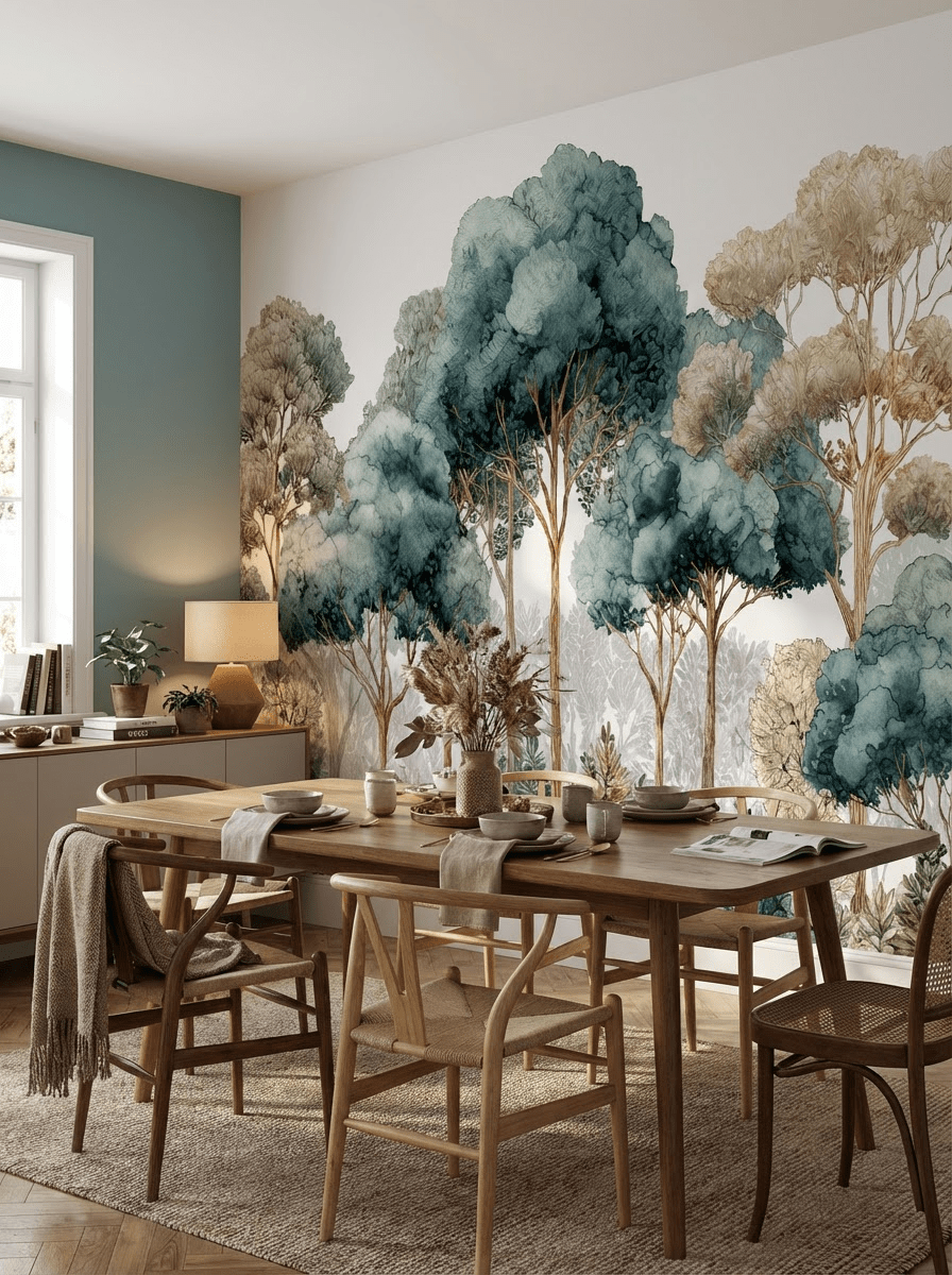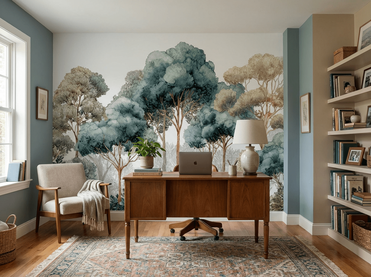 Le papier peint panoramique forêt Évasion Boisée Vert Sauge est idéal pour créer un point focal élégant.