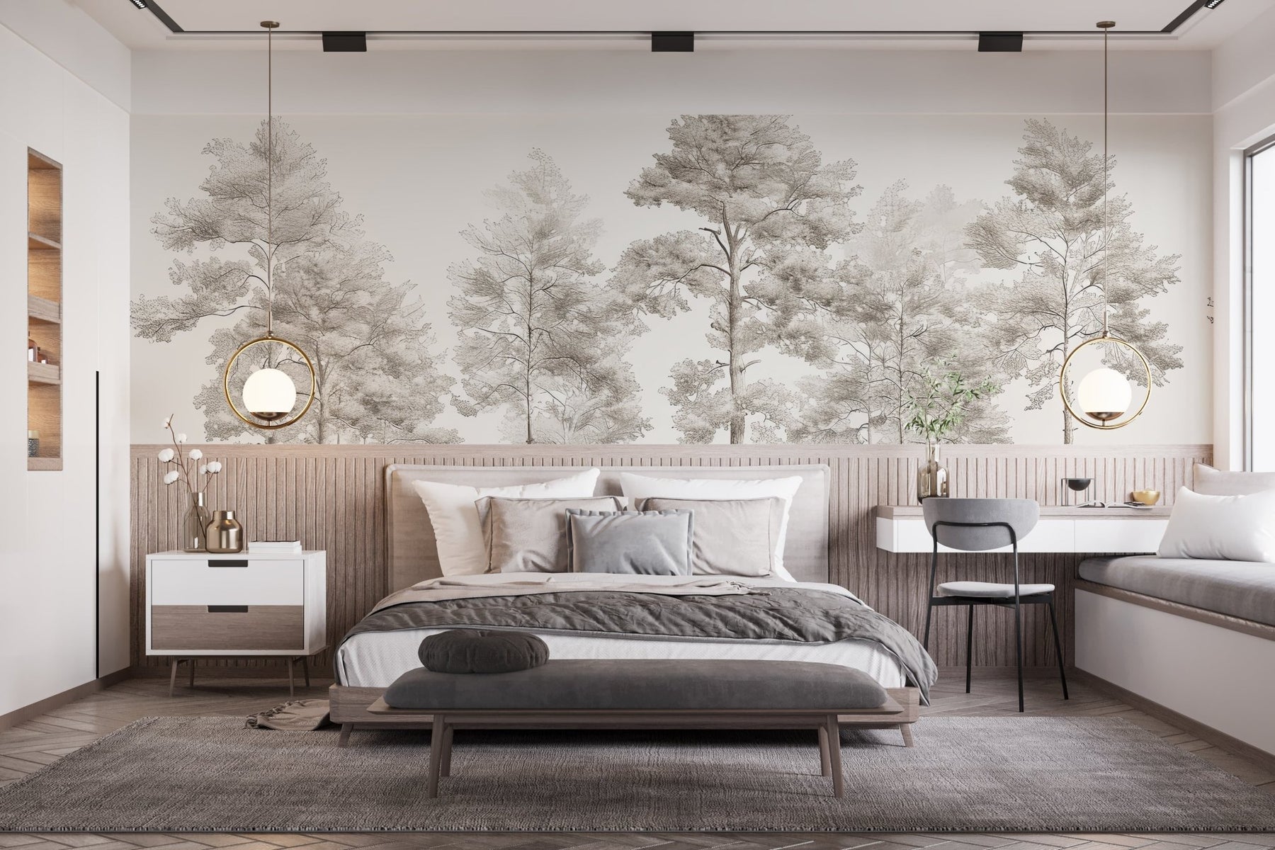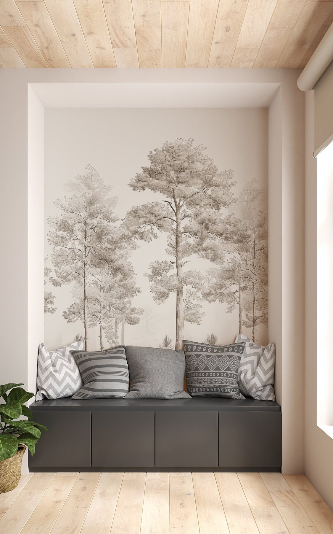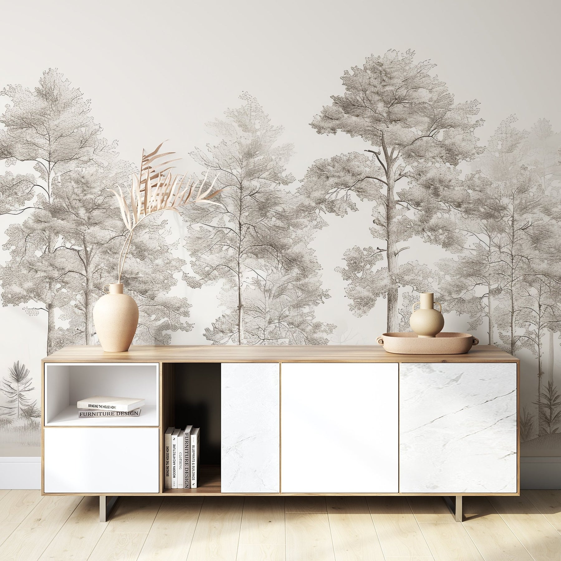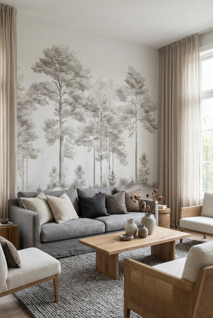 Découvrez le papier peint panoramique "Douceurs des bois - Arbres en Beige et Gris", une véritable invitation à la sérénité et à la contemplation. Ce design raffiné, illustré de délicats dessins d'arbres, transforme vos murs en une œuvre d'art naturelle.