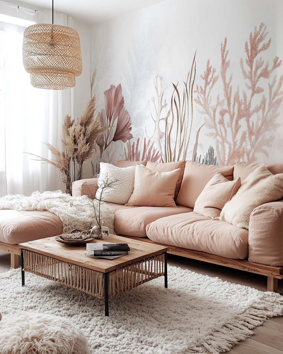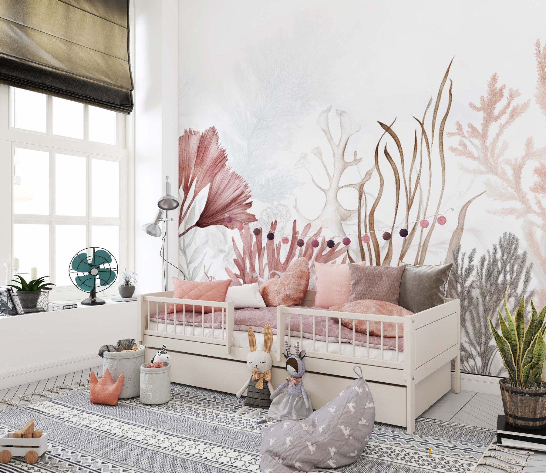 Transformez votre mur en un havre marin avec Jardin de corail, un papier peint végétal aquatique aux tons poudrés. Ce décor évoque un jardin sous-marin, où coraux et algues s’entrelacent dans une danse délicate. Ses nuances rosées, brunes et grises apportent une touche apaisante à votre intérieur.