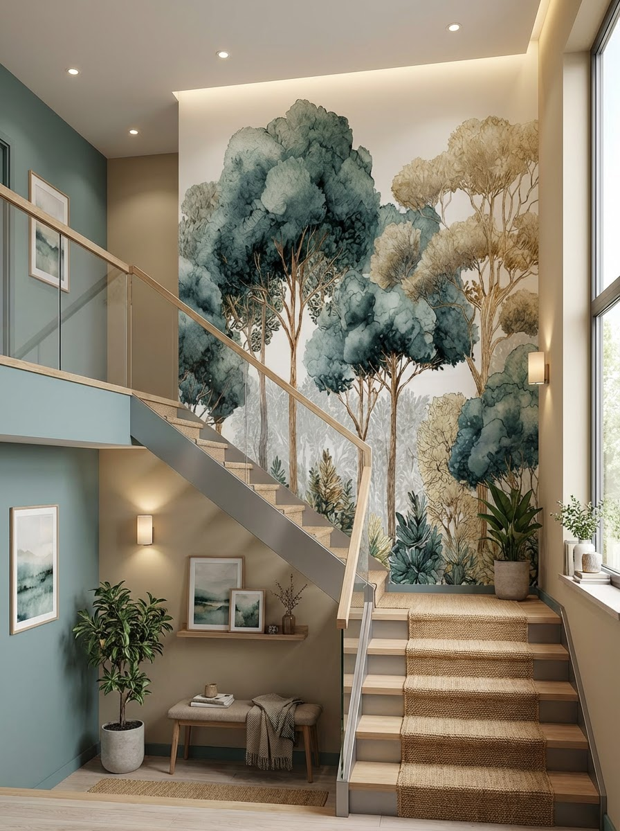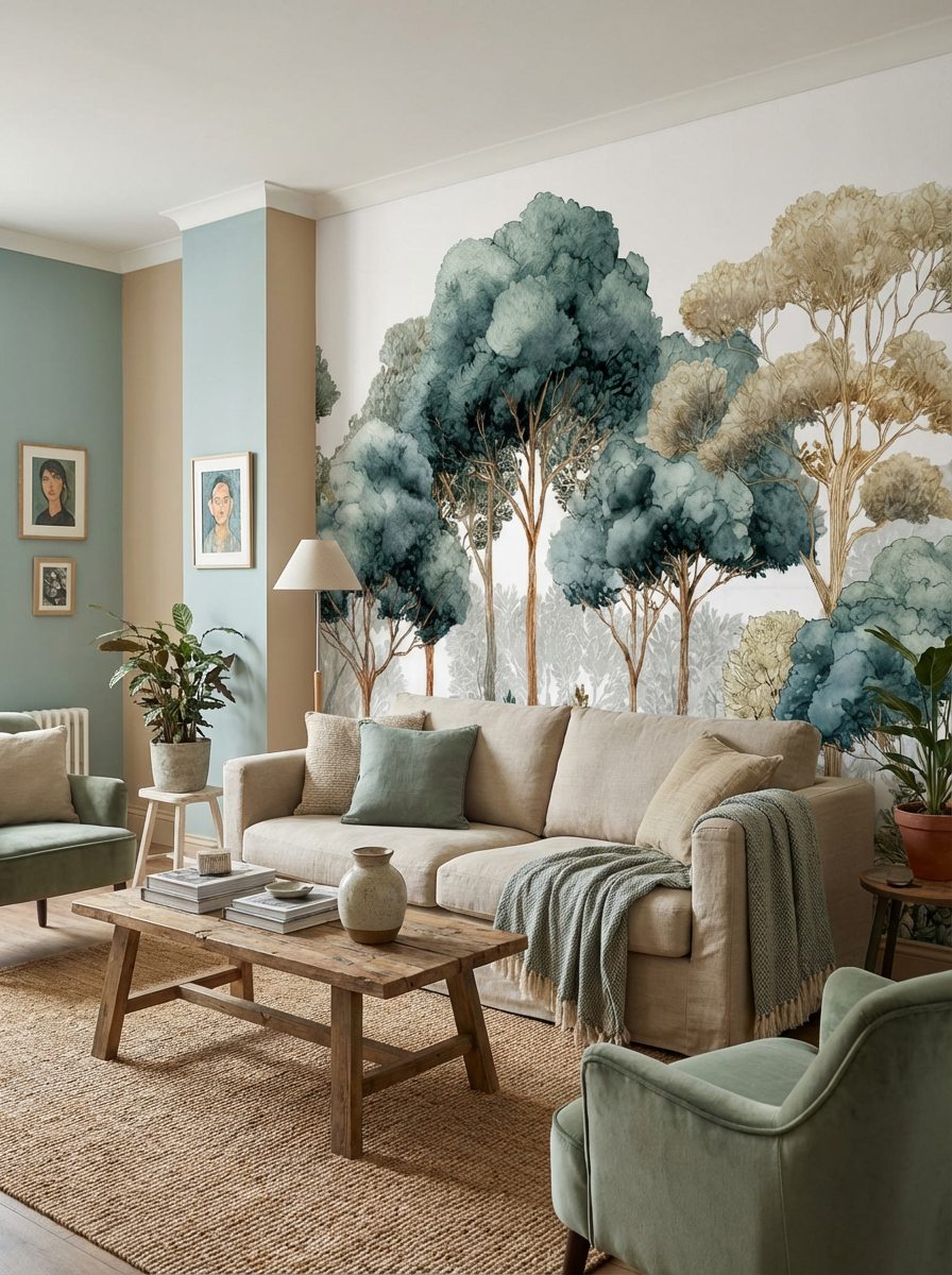 Le papier peint panoramique forêt Évasion Boisée Vert Sauge est idéal pour créer un point focal élégant.