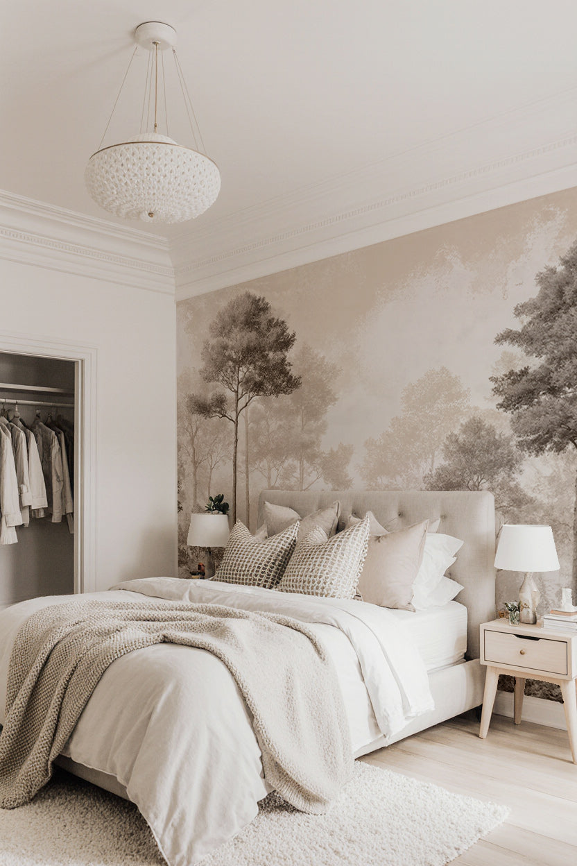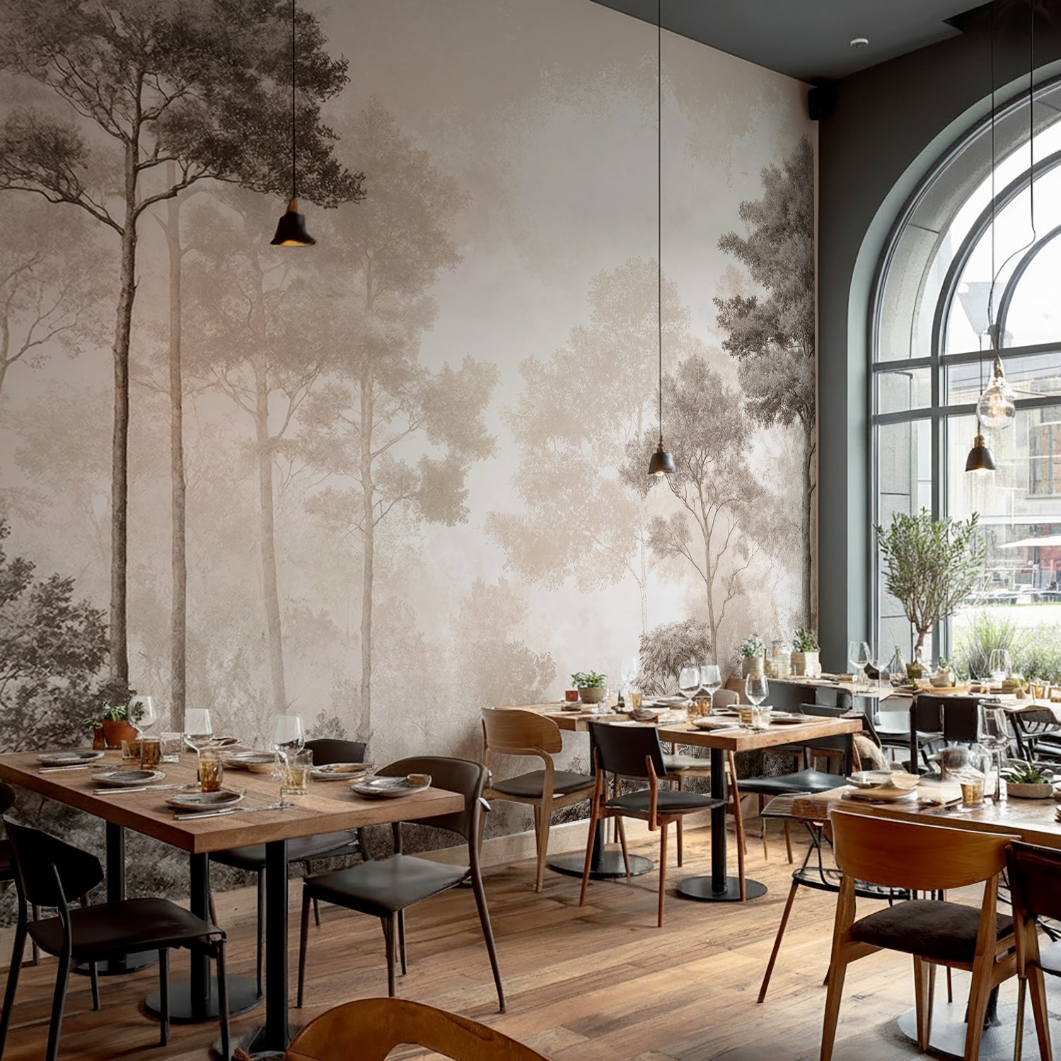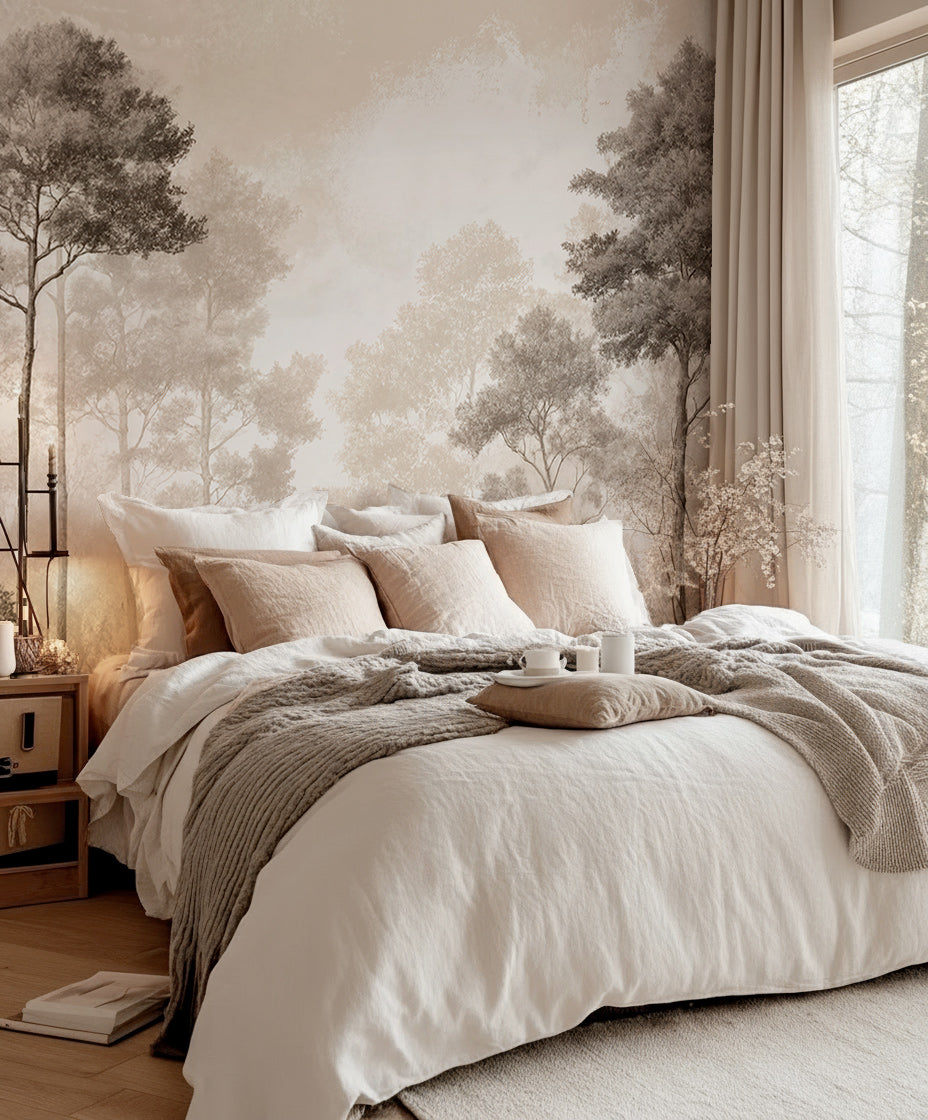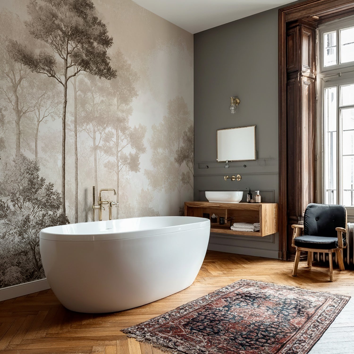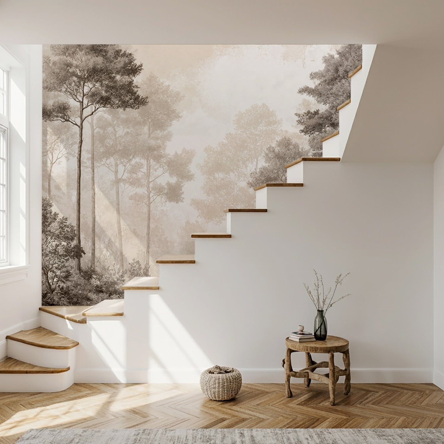 Chaque détail est finement travaillé : feuillages diffus, contrastes délicats, profondeurs superposées. Le papier peint forêt devient ici une invitation à ralentir, à respirer.