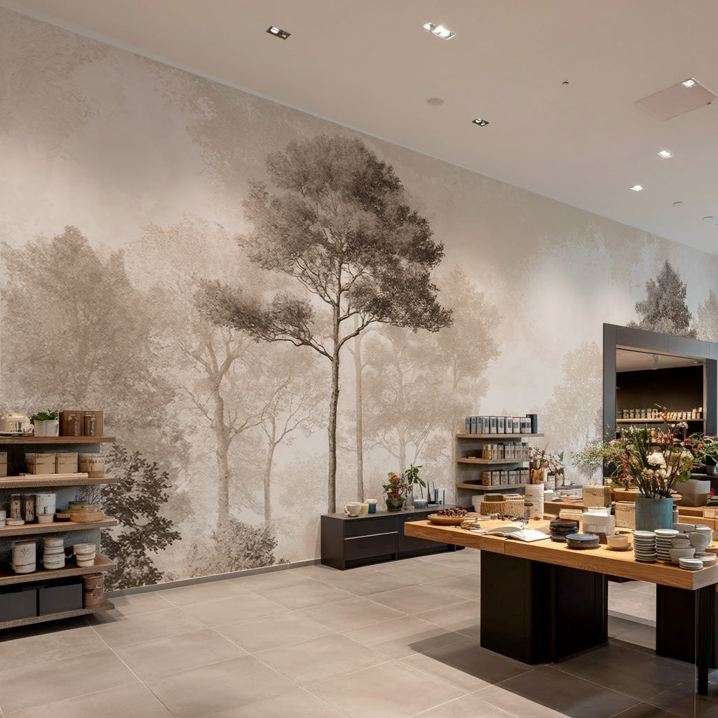 Forêt des Silences – Papier Peint Arbres Enveloppés de Brume Douce en Sépia