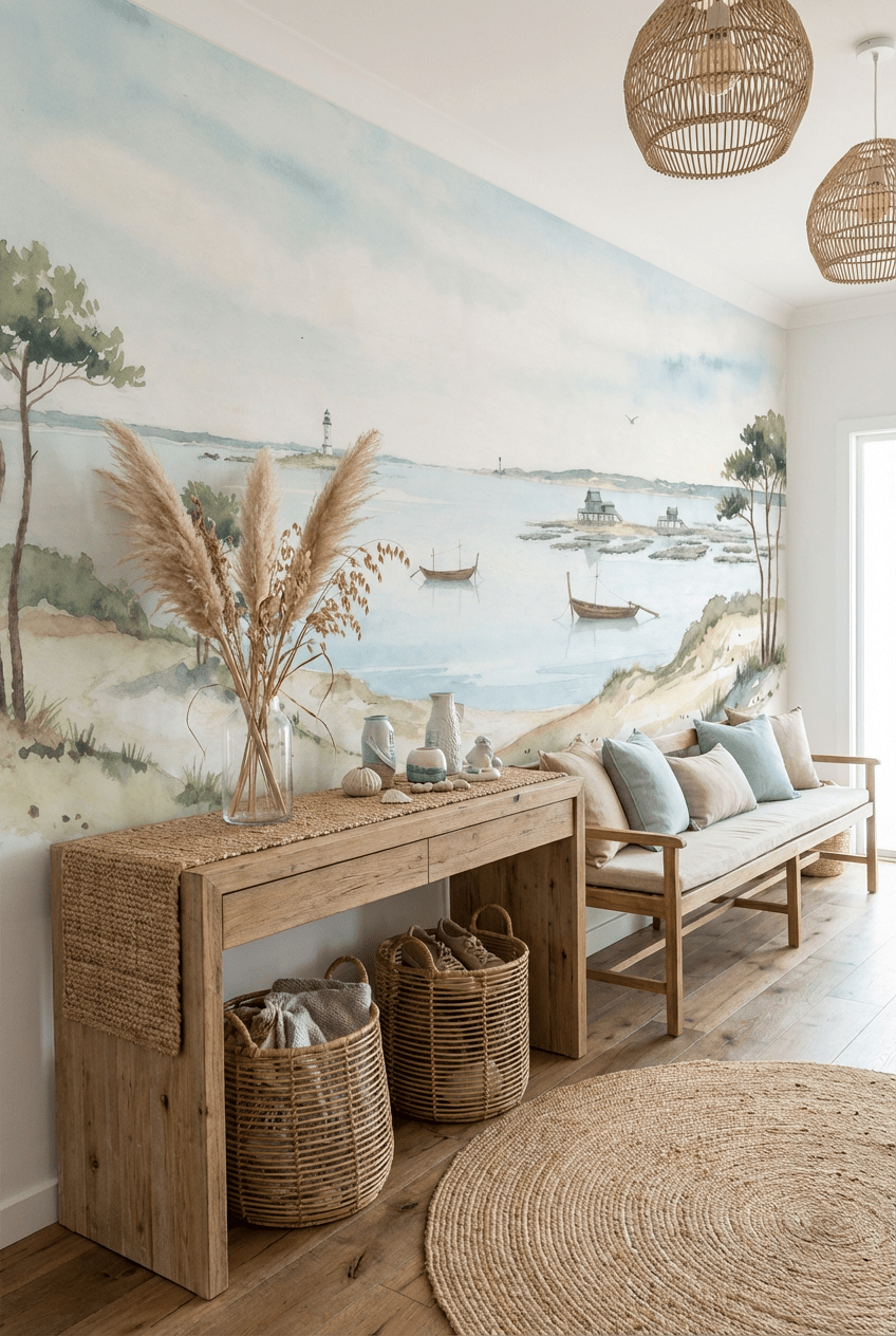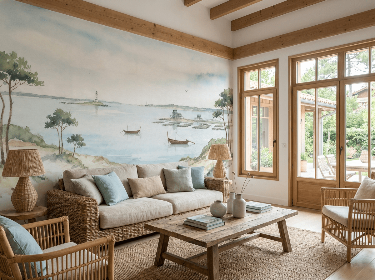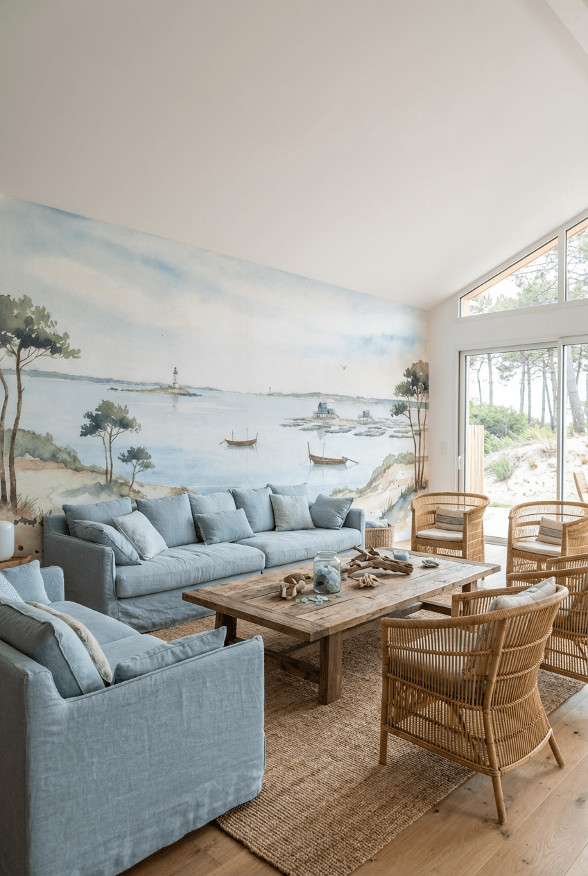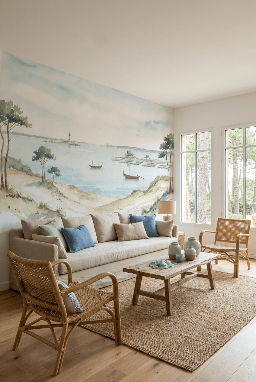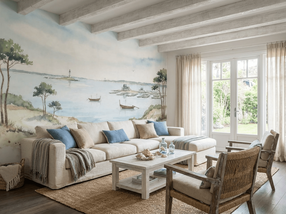Ce décor convient particulièrement à un salon apaisant, une chambre parentale, une entrée lumineuse ou un espace de détente. Il apporte une note de voyage discrète et un souffle d’air marin sans surcharger l’intérieur.