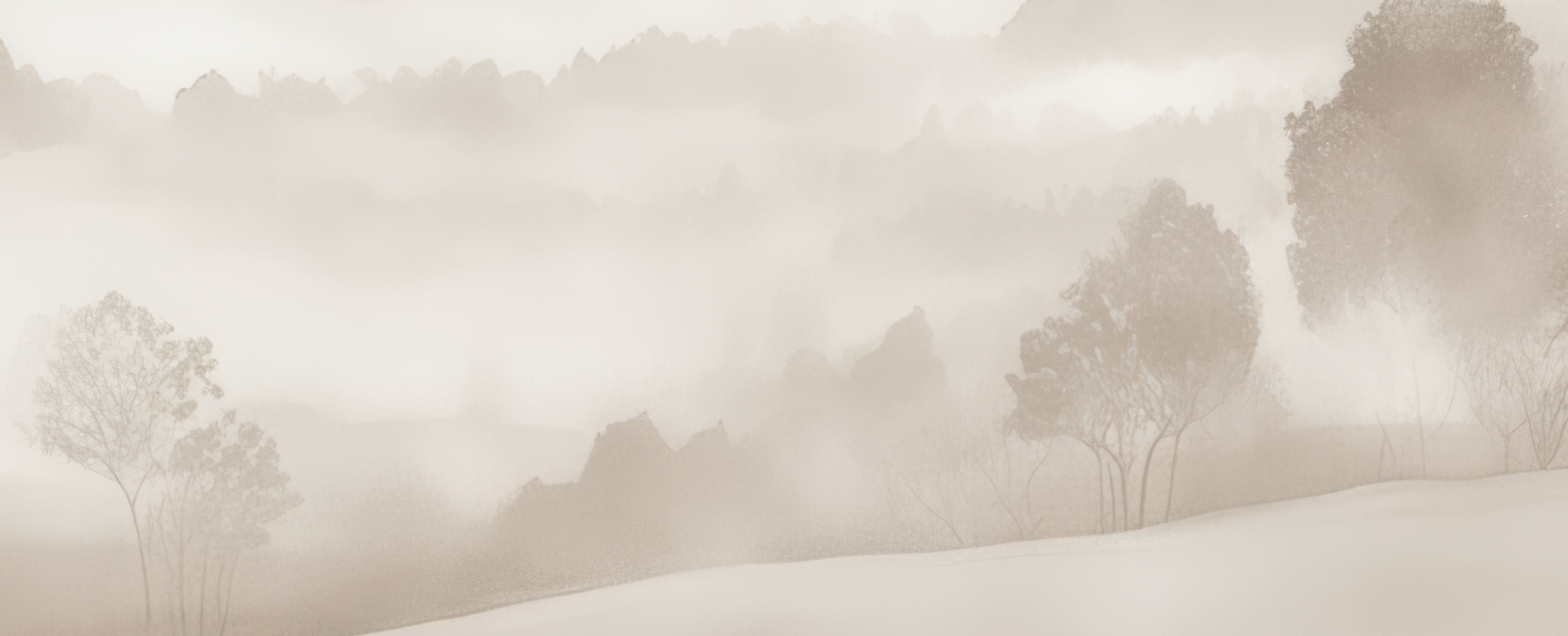 Chaque détail, des arbres flous aux collines en dégradé, évoque la quiétude d’un lever de soleil embrumé.