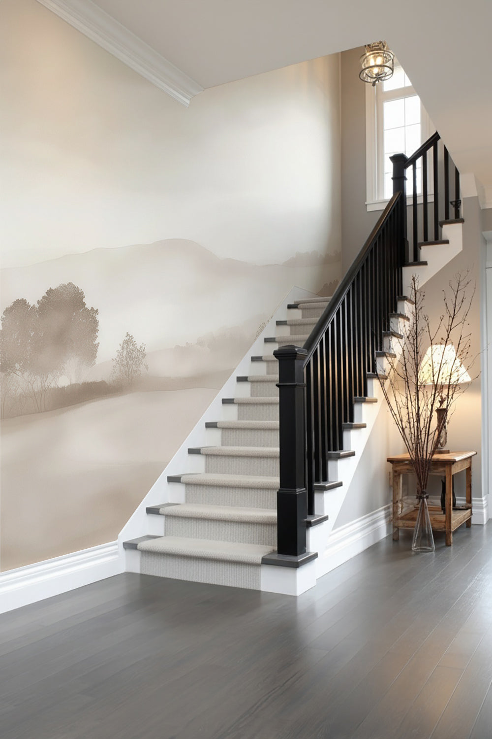Ce papier peint paysage brumeux est idéal dans une chambre, un salon ou un espace bien-être.