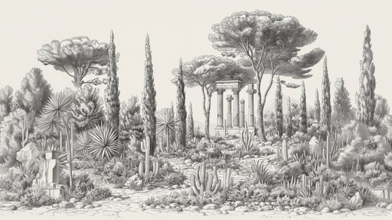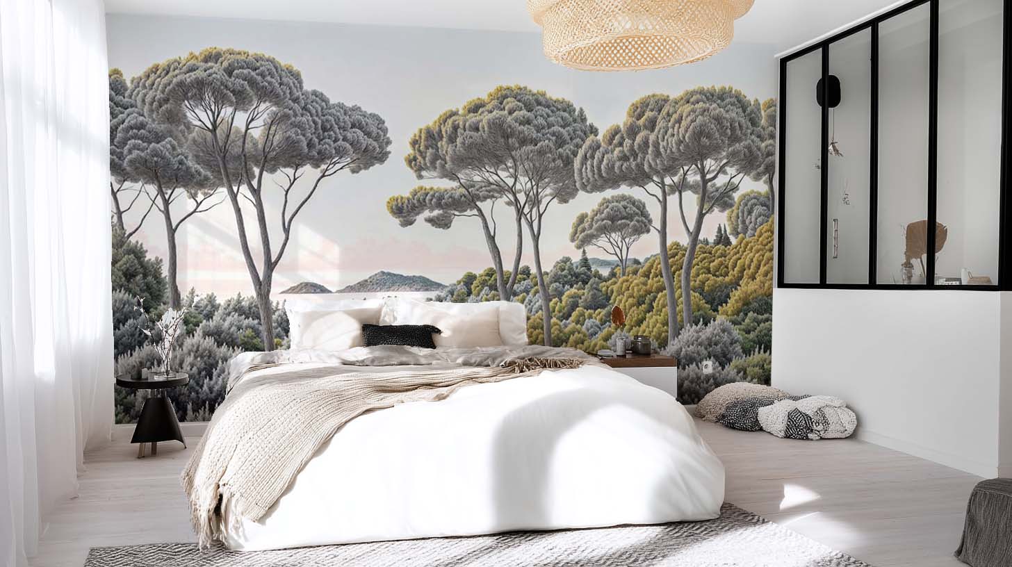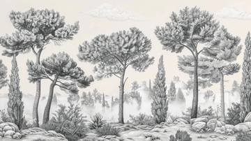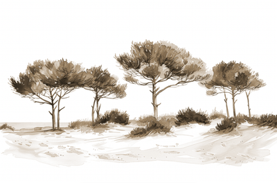 Oasis Antique - Papier peint méditerranéen Murmure des Pins sous Brume Matinale Poésie des Pins : Paysage d'Estampe Les Pins de la Plage : Évasion Naturelle  Couleur Sépia Tradition des Cyprès: Élégance Murale Panoramique Vintage
