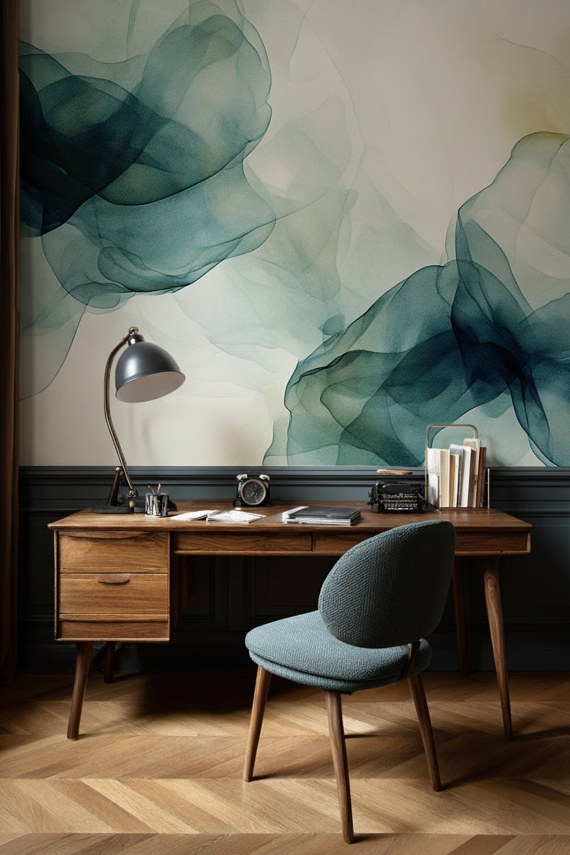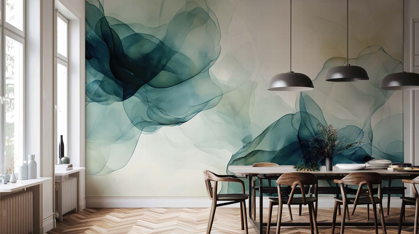 Fusion de Transparence en Émeraude : Papier Peint Panoramique Aquarelle Abstraite - Illulart: Papier peint panoramique